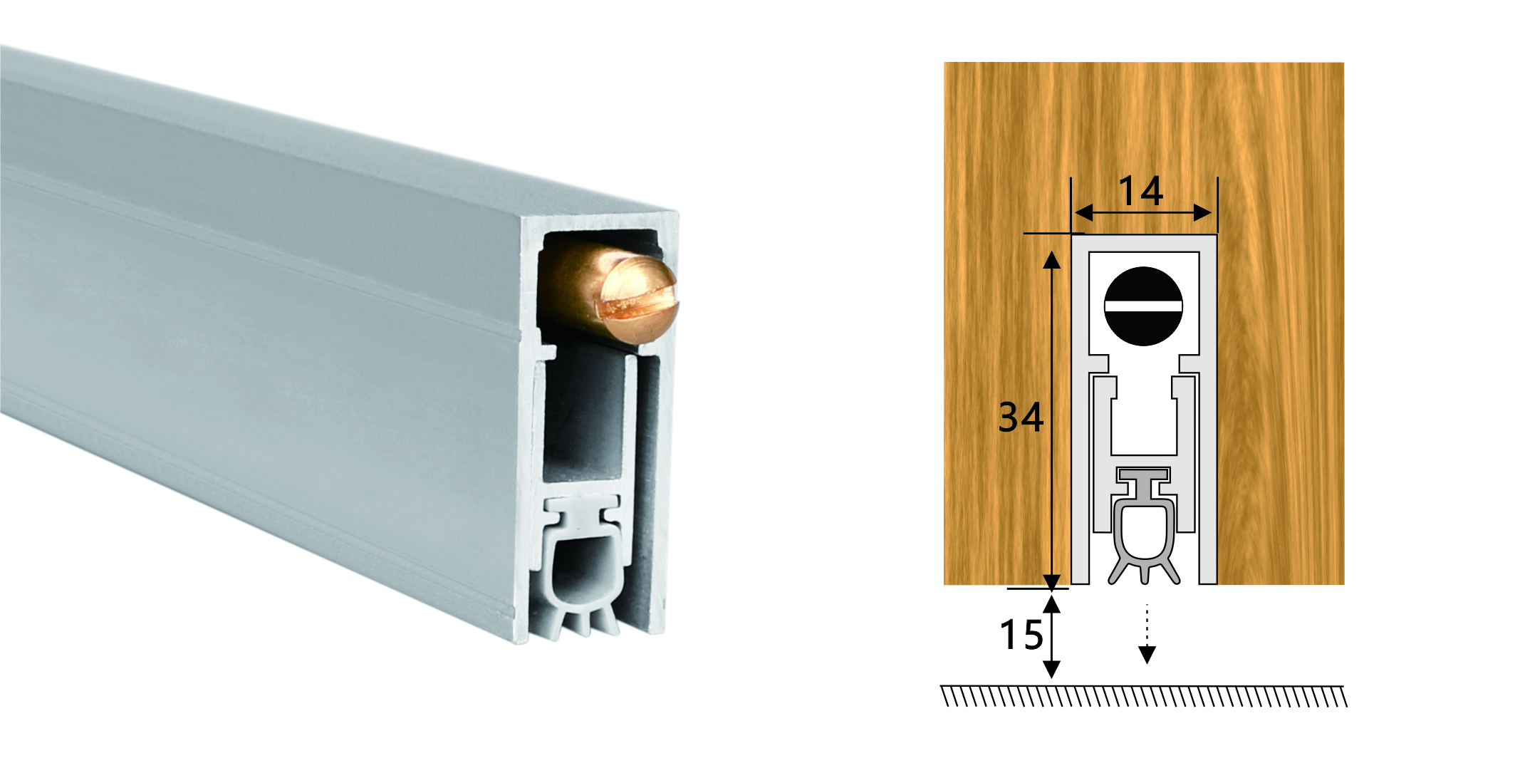 嵌入式門底自動(dòng)升降式密封器,四連桿機(jī)構(gòu),適用于門扇內(nèi)開槽的門。安裝時(shí)需在門底有一個(gè)34mm*14mm的通槽,將產(chǎn)品放置其中,將兩端蓋板和密封器用螺絲固定(或用螺絲從密封條底部向上固定),使用本產(chǎn)品不影響門的整體風(fēng)格。