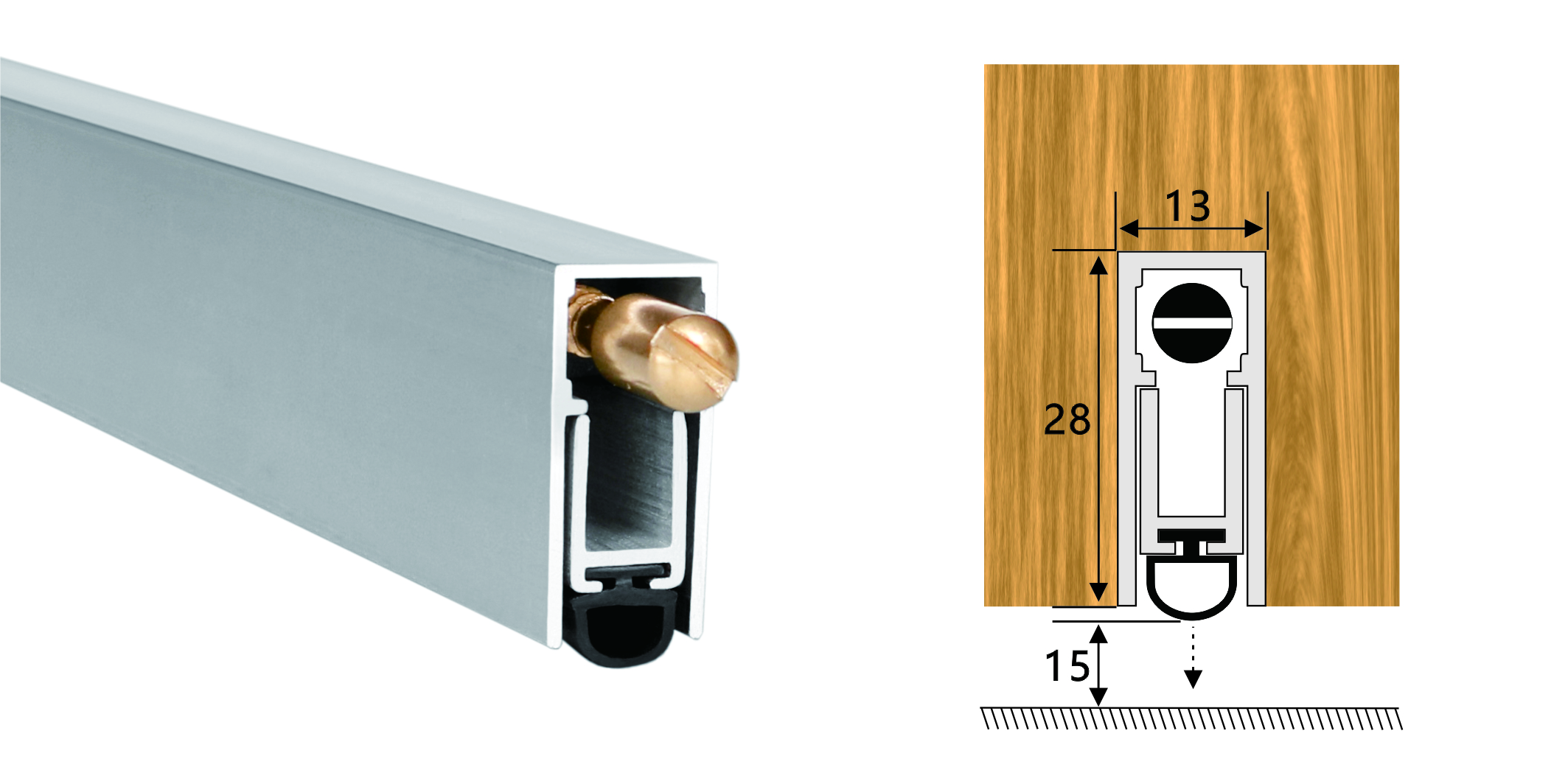 嵌入式門底自動(dòng)升降式密封器,四連桿機(jī)構(gòu),適用于門扇內(nèi)開槽的門。安裝時(shí)需在門底有一個(gè)28mm*13mm的通槽,將產(chǎn)品放置其中,將兩端蓋板和密封器用螺絲固定(或用螺絲從密封條底部向上固定),使用本產(chǎn)品不影響門的整體風(fēng)格。