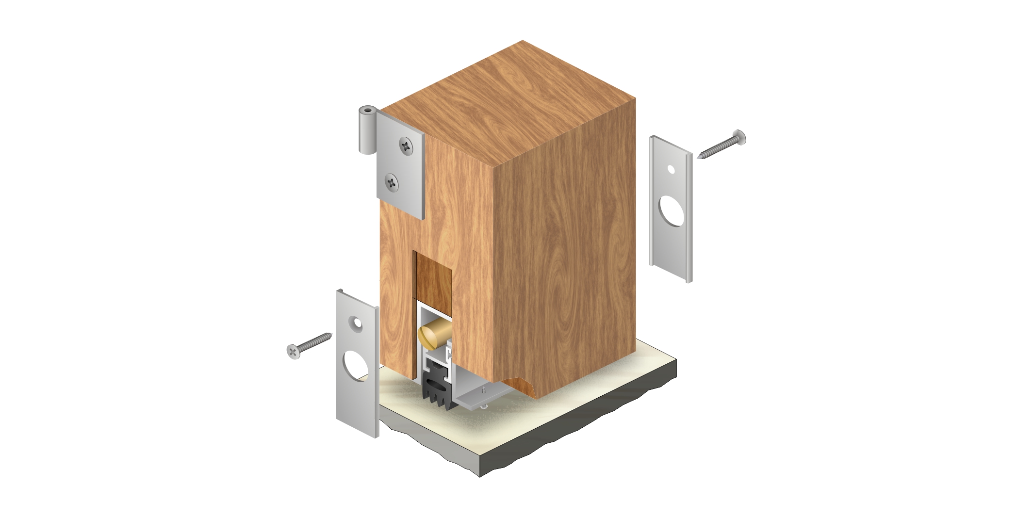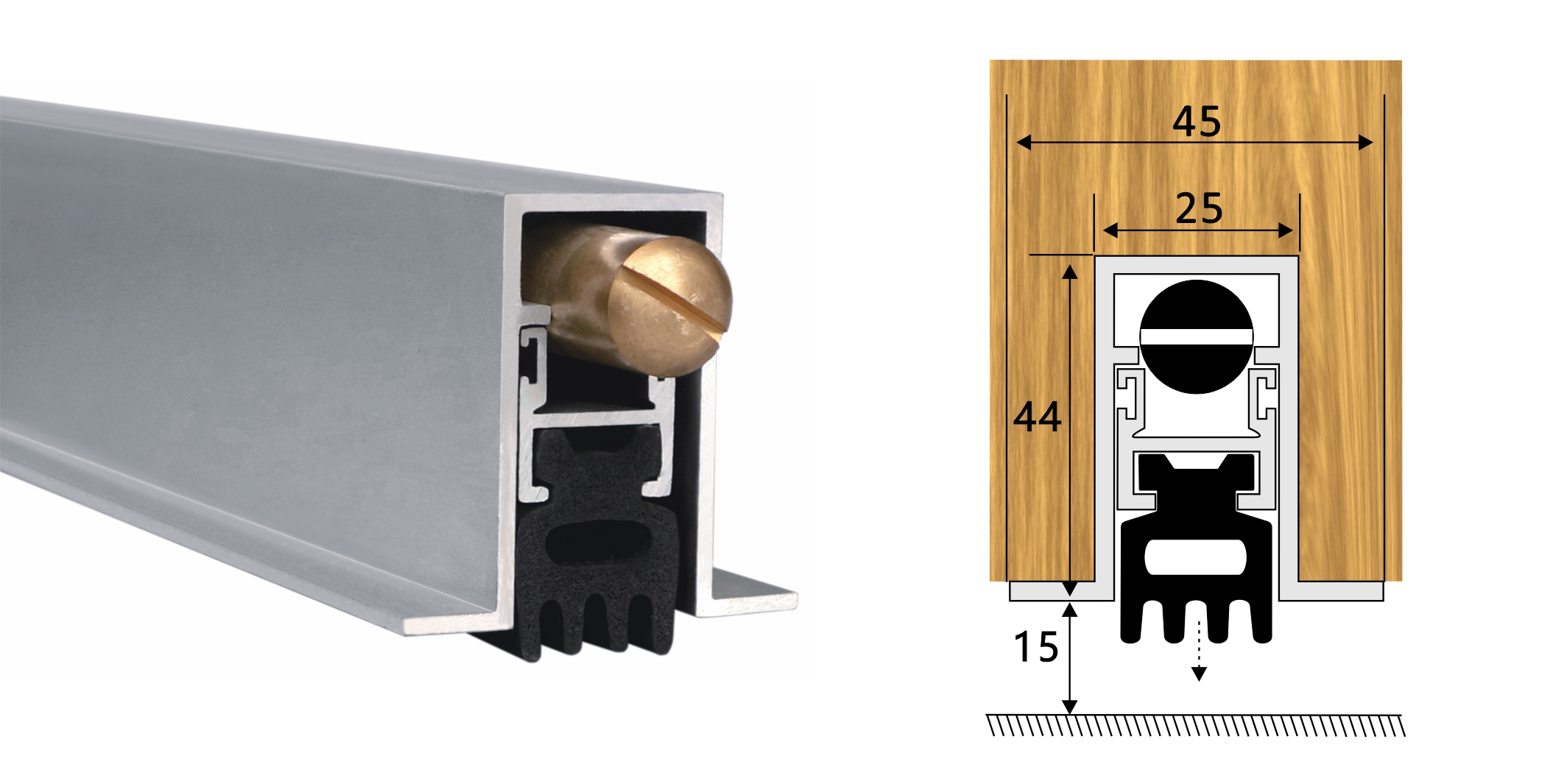 為重型門而設(shè)計(jì),門的厚度要大于45mm,多用于工礦企業(yè)對(duì)隔音要求高的門。安裝時(shí)需在門底加工一條44mm*25mm的通槽,將產(chǎn)品放置其中,從產(chǎn)品的翼上固定,并將裝飾端蓋板用螺絲裝上,使用本產(chǎn)品不影響門的整體風(fēng)格。