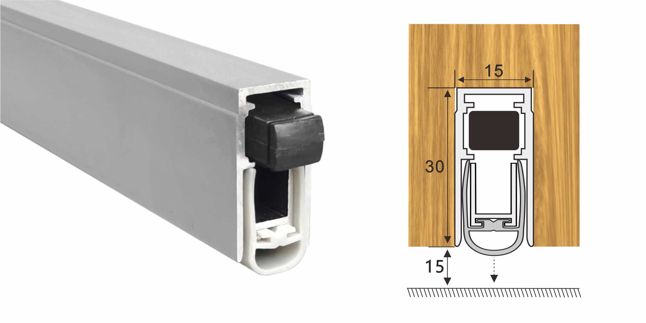 嵌入式門底自動升降式密封器,四連桿機構(gòu),適用于門扇內(nèi)開槽的門。安裝時需在門底加工一條30mm*15mm的通槽,將產(chǎn)品放置其中,將兩端蓋板和密封器用螺絲固定,使用本產(chǎn)品不影響門的整體風格。