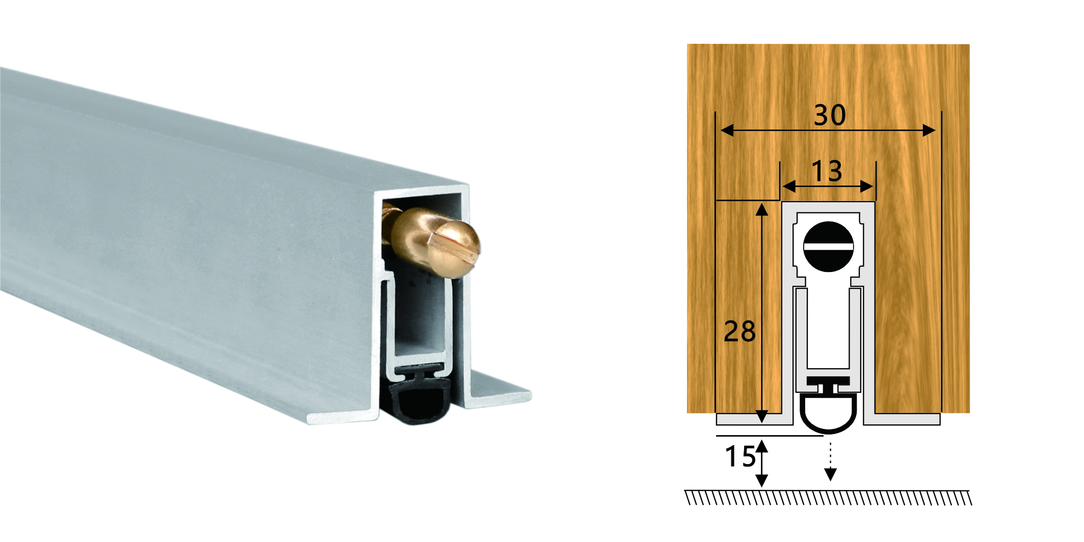 嵌入式門(mén)底自動(dòng)升降式密封器,四連桿機(jī)構(gòu),適用于門(mén)扇內(nèi)開(kāi)槽的門(mén)。安裝時(shí)需在門(mén)底有一個(gè)28mm*13mm的通槽,將產(chǎn)品放置其中,將兩端蓋板和密封器用螺 絲固定(或用螺絲從密封條底部向上固定),使用本產(chǎn)品不影響門(mén)的整體風(fēng)格。