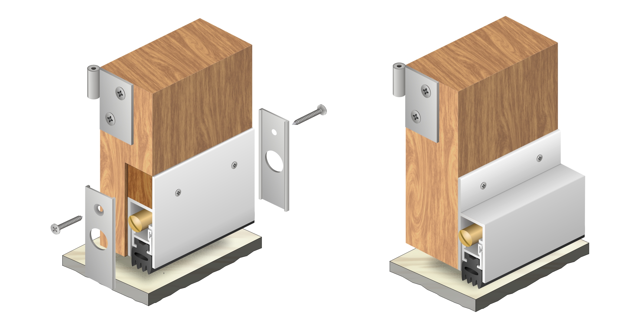 為重型門而設(shè)計,可半嵌式安裝或外裝,調(diào)節(jié)鈕有在右側(cè)或左側(cè)之分,可以適應(yīng)右開門或左開門,多用于工礦企業(yè)對隔音要求高的門。半嵌入式安裝需在門底預(yù)留44mm高度,將產(chǎn)品放置其位,用螺釘在翼上固定。